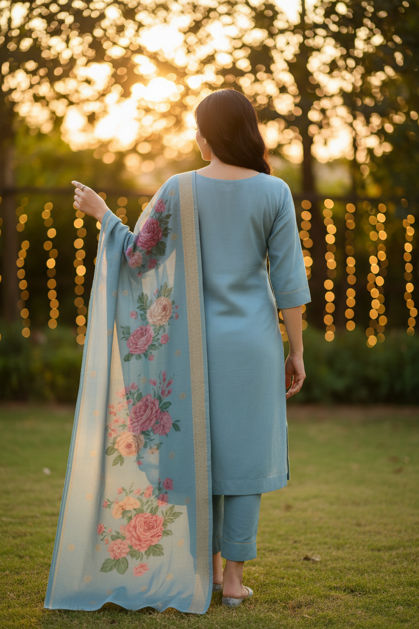 Step into the spotlight with this breathtaking Powder Blue Suit Set, a perfect blend of modern grace and traditional charm. Crafted from high-quality fabric, the straight-cut kurta features delicate embroidery along the neckline and is adorned with romantic pink rose motifs that pop against the serene blue background.