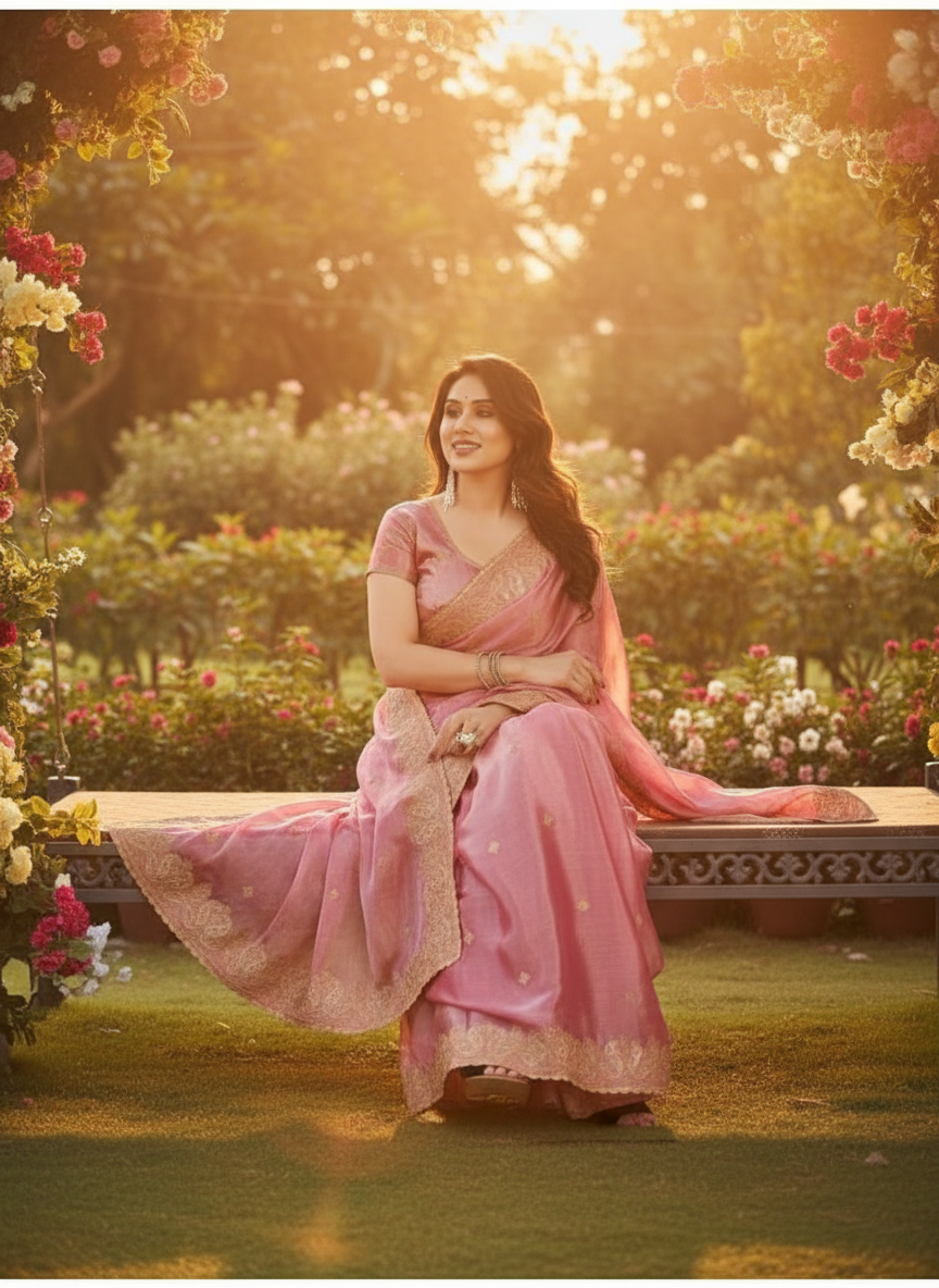 Embrace timeless elegance with this stunning soft pink saree. Crafted from a lustrous, shimmering fabric, this piece features intricate zari embroidery along a delicate scalloped border. The body of the saree is dusted with subtle floral motifs, catching the light beautifully. Paired with a matching embroidered blouse, this ensemble is perfect for daytime weddings, garden parties, or festive celebrations.